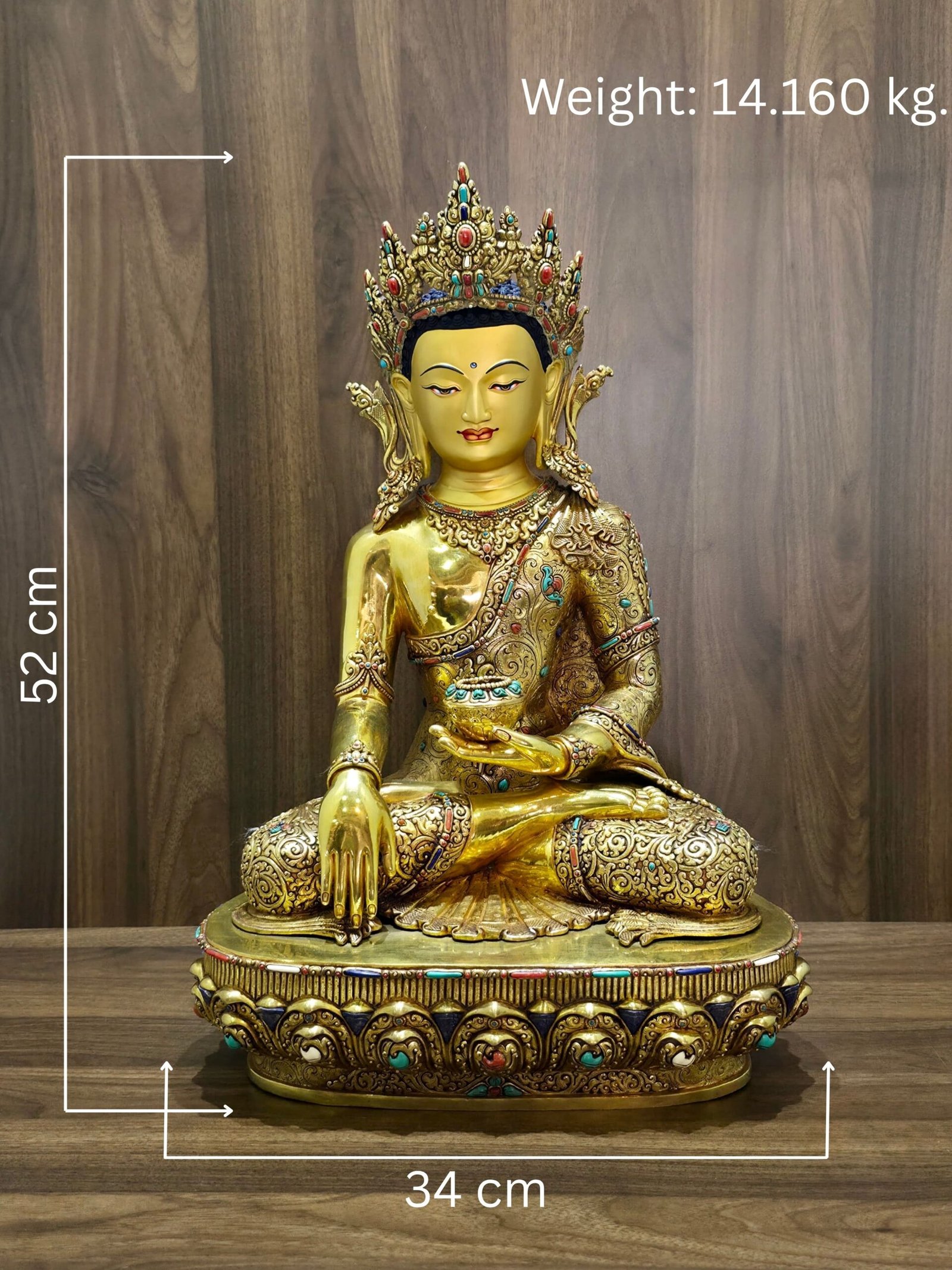 Crown Shakyamuni Buddha Statue, 24 K Gold Plated Copper, 52 cm, Jewelled Crown