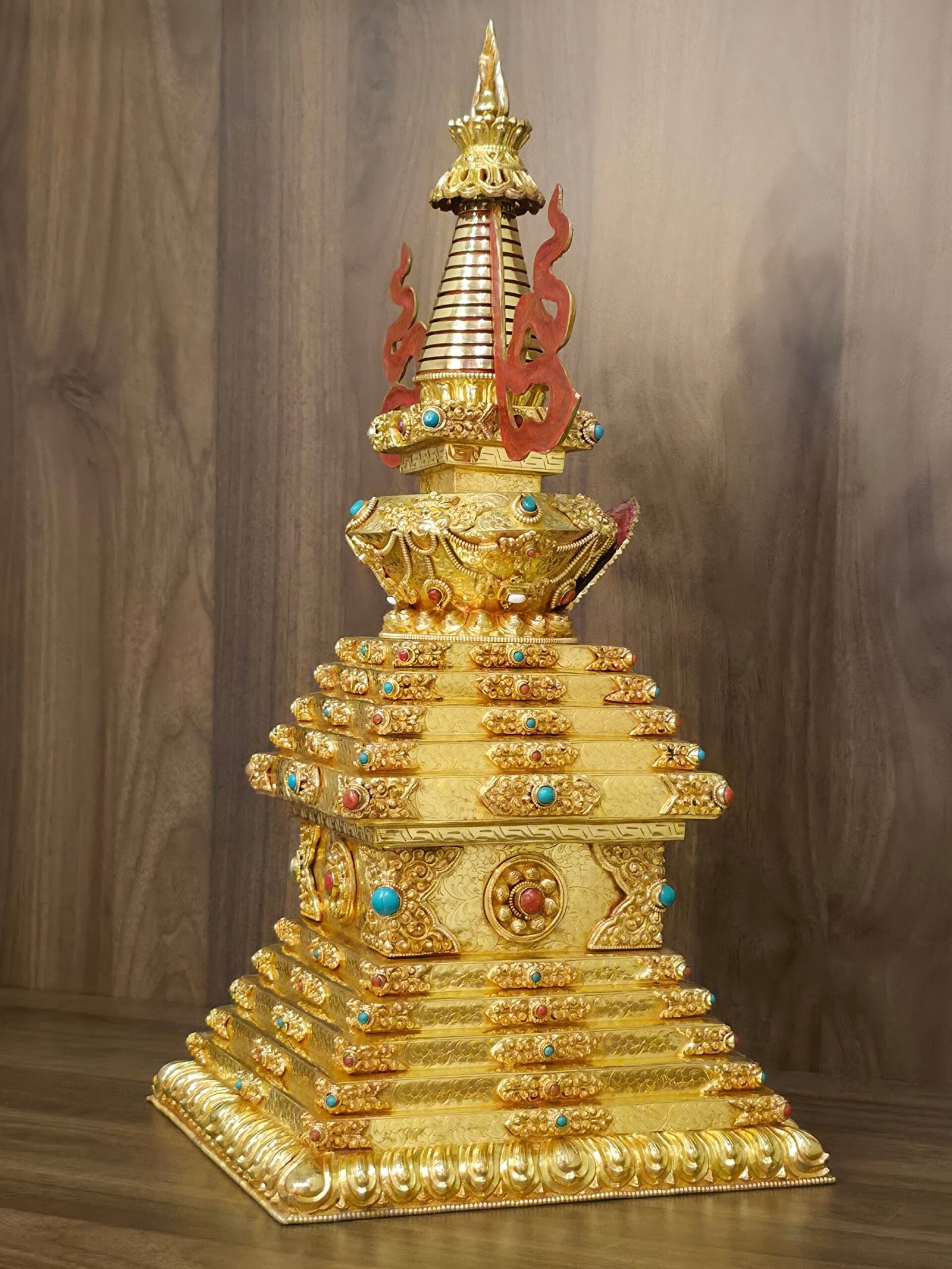 –> Strong Altar Presence: With its tall profile and heavily ornamented base, this stupa has a bold visual presence that becomes a centerpiece for a shrine or practice space.