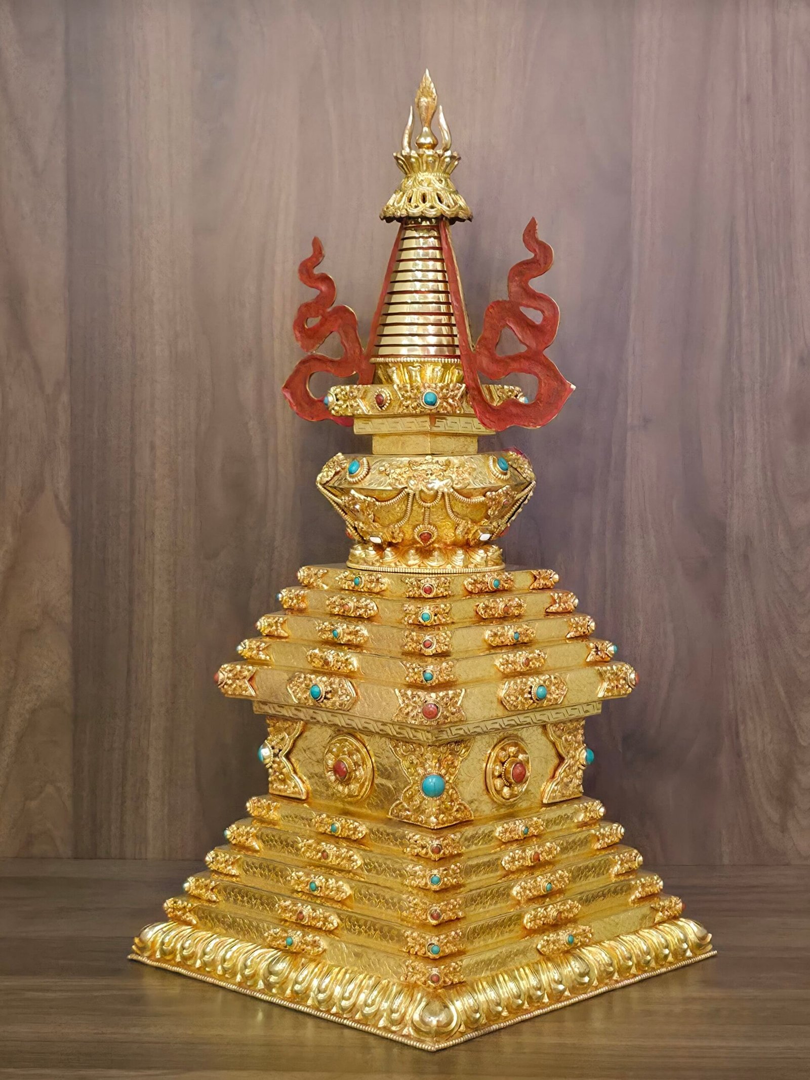 –> Cleaning: Gently wipe the stupa with clean, dry cotton. Do not use water, polishes, or any cleaning chemicals, as these may damage the gold plating and fine details. Coarse materials or rough handling could dull or scratch the surface.