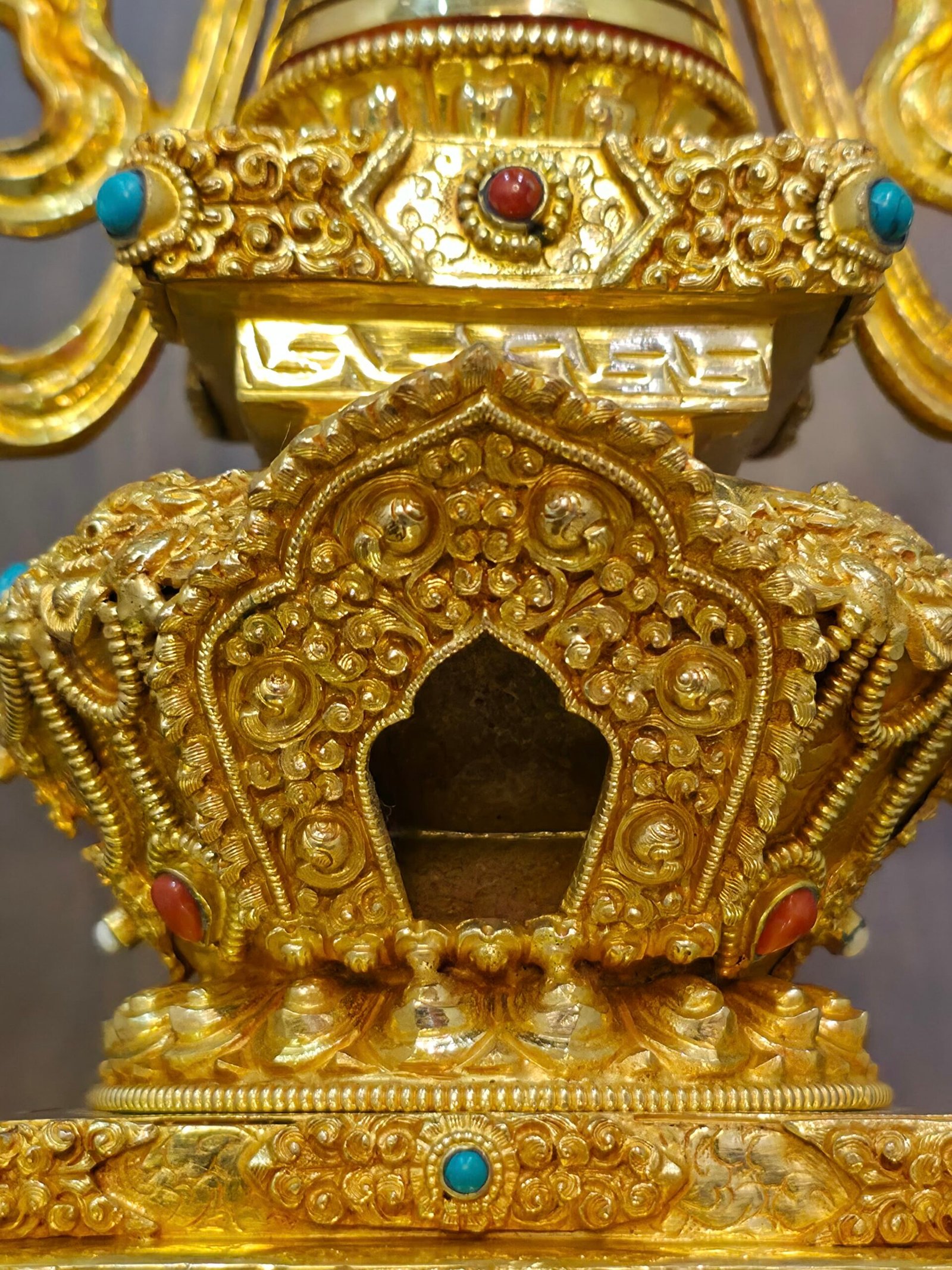 This piece is crafted in a highly ornate Tibetan inspired form, with layered tiers and dense detailing that create a striking devotional presence for your home shrine or meditation space.