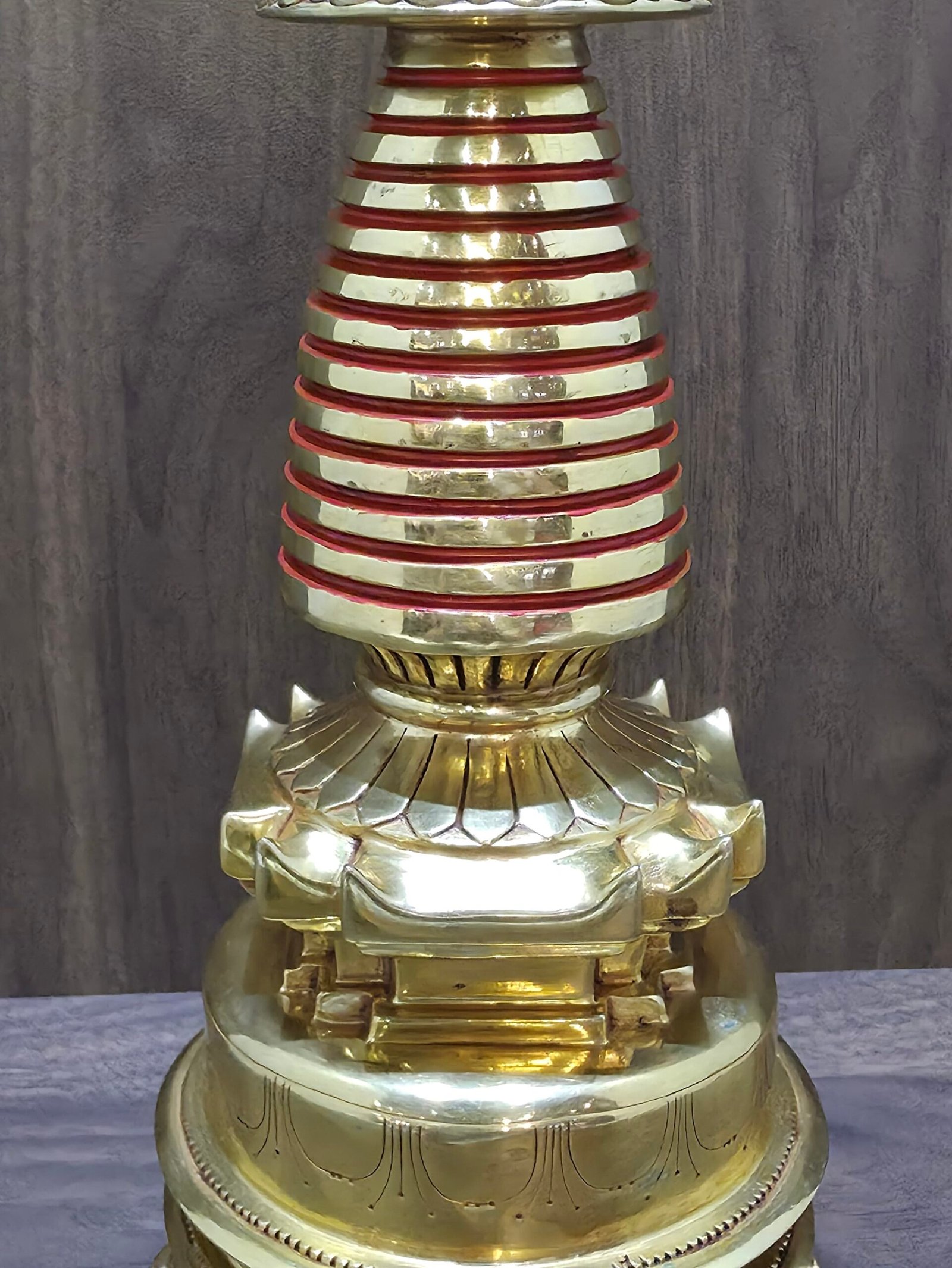 –> Cleaning: Gently wipe the stupa with clean, dry cotton. Do not use water, polishes, or any cleaning chemicals, as these may damage the gold plating and fine details. Coarse materials or rough handling could dull or scratch the surface.