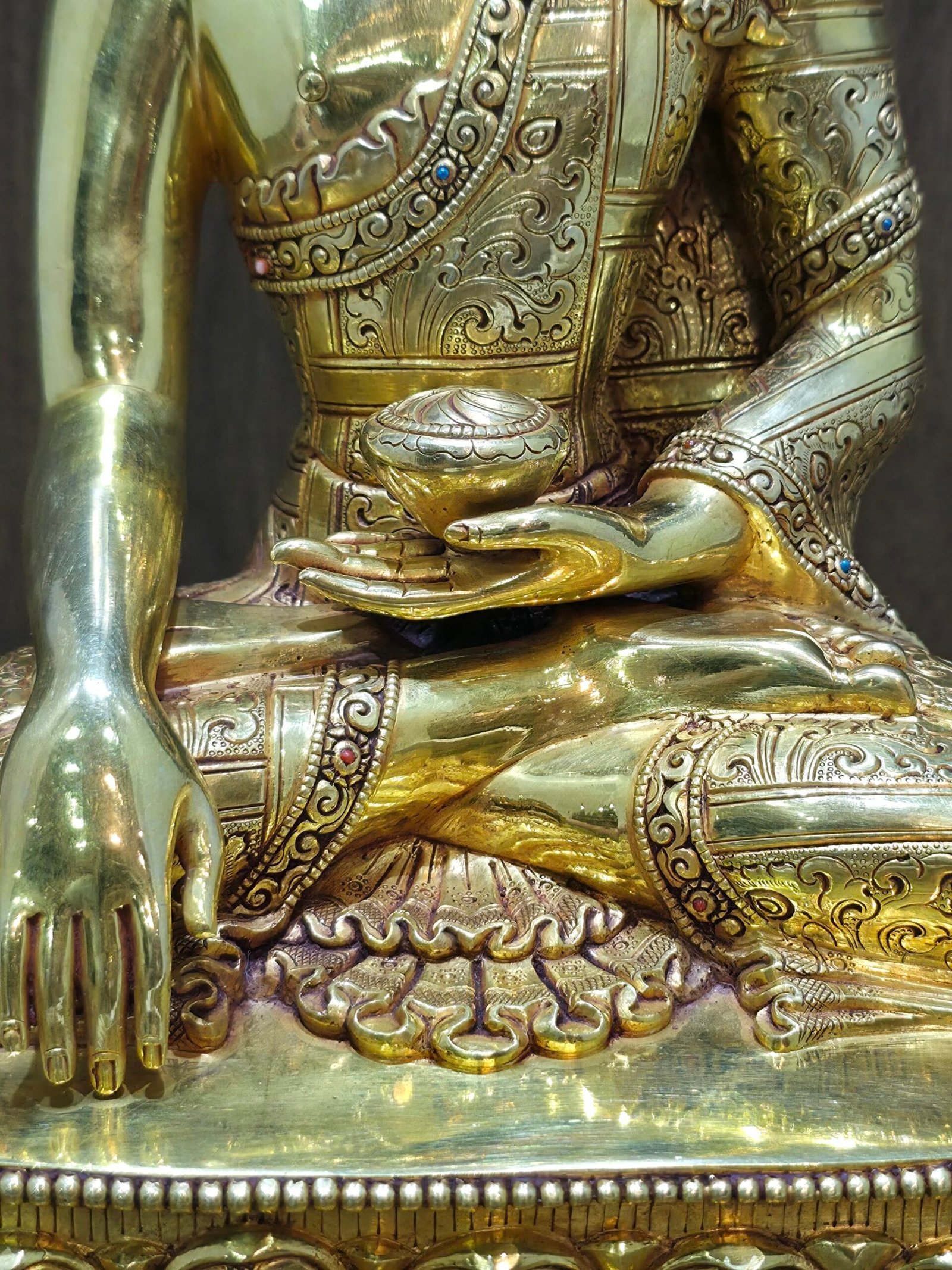 The Ushnisha and Urna: Shakyamuni’s tightly curled hair rises to a pointed flame finial, the ushnisha, representing his transcendent wisdom and enlightened consciousness. Between his brows rests the urna, a small circular mark symbolising his ability to perceive all realms of existence with perfect clarity.