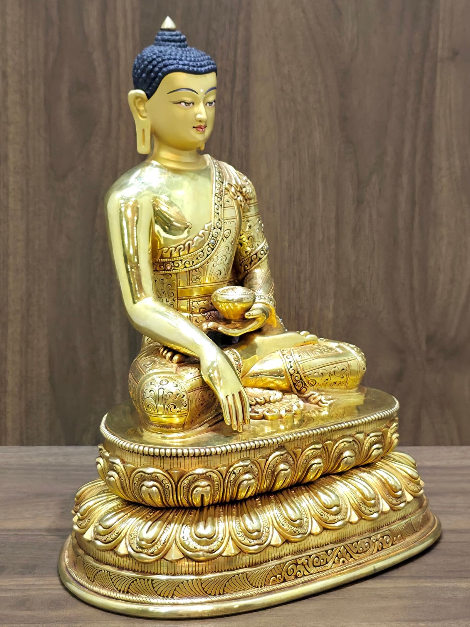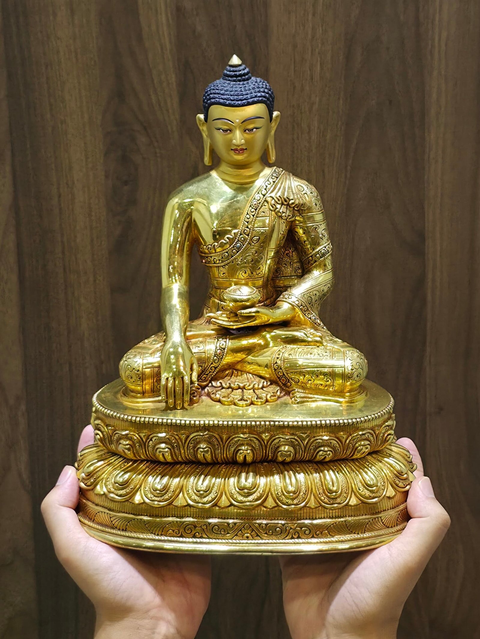 This Shakyamuni Buddha statue is a master-class devotional piece handcrafted in Kathmandu, Nepal. Cast in solid copper and finished with radiant 24K gold plating, it features a serene face meticulously hand-painted with pure gold powder. This statue is a foundational piece for any altar, meditation room, or collection of fine Himalayan art.