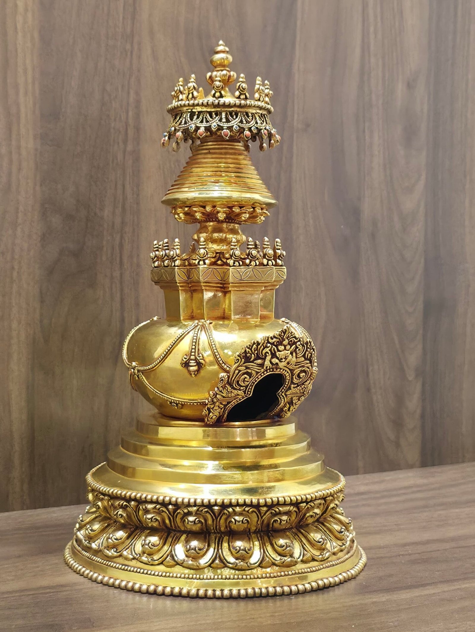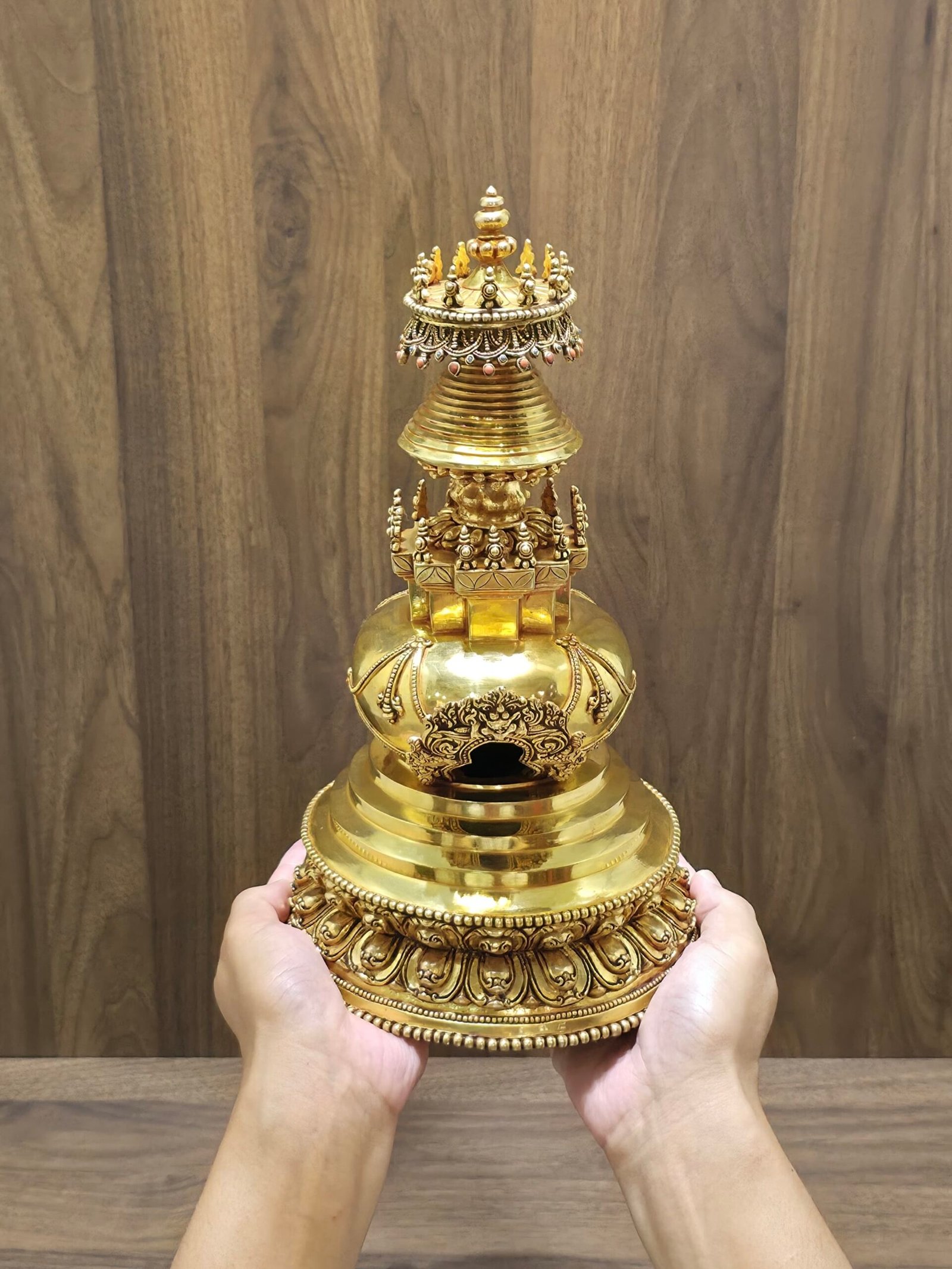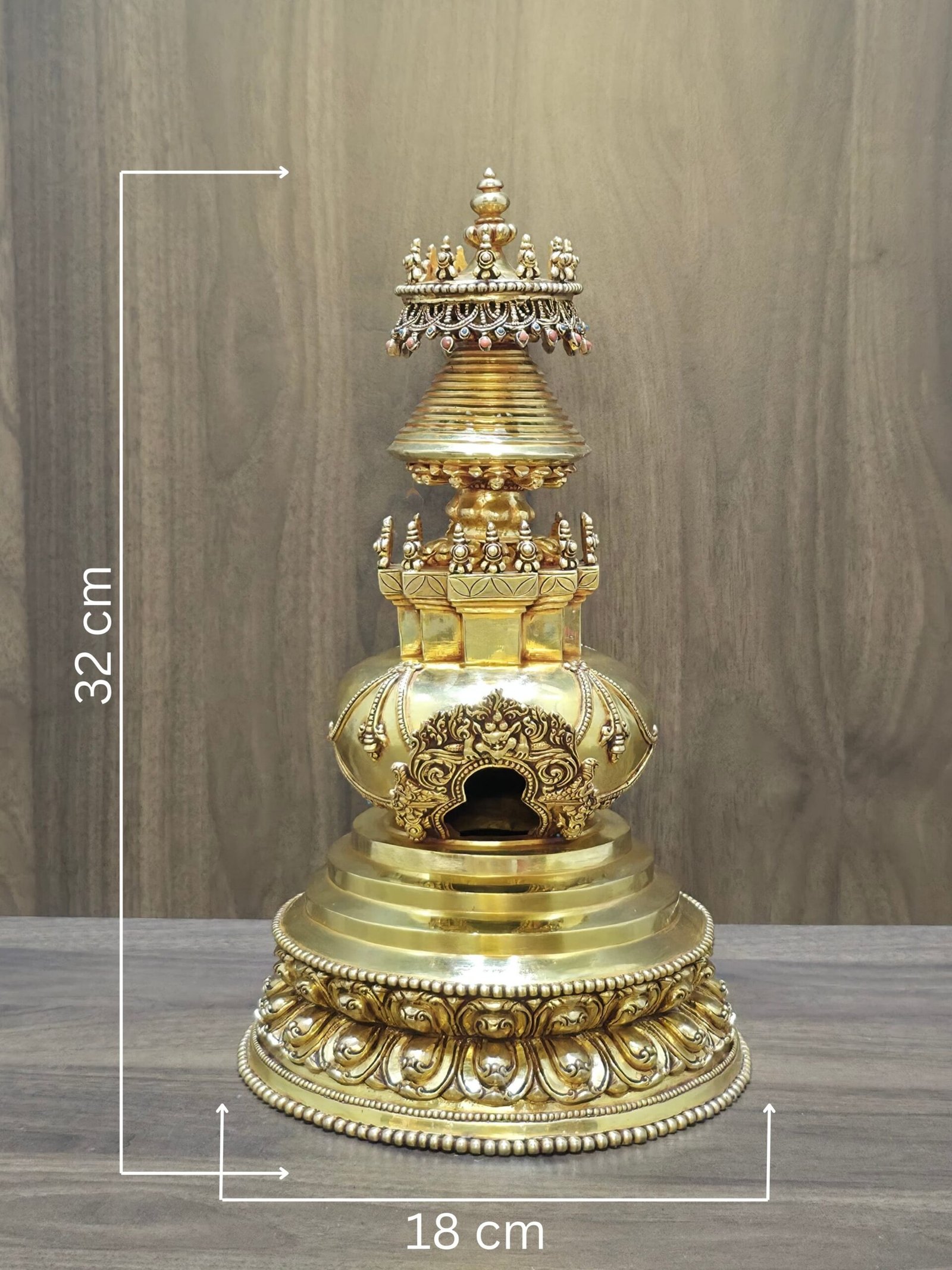 –> Cleaning: Gently wipe the stupa with clean, dry cotton. Do not use water, polishes, or any cleaning chemicals, as these may damage the gold plating and fine details. Coarse materials or rough handling could dull or scratch the surface.